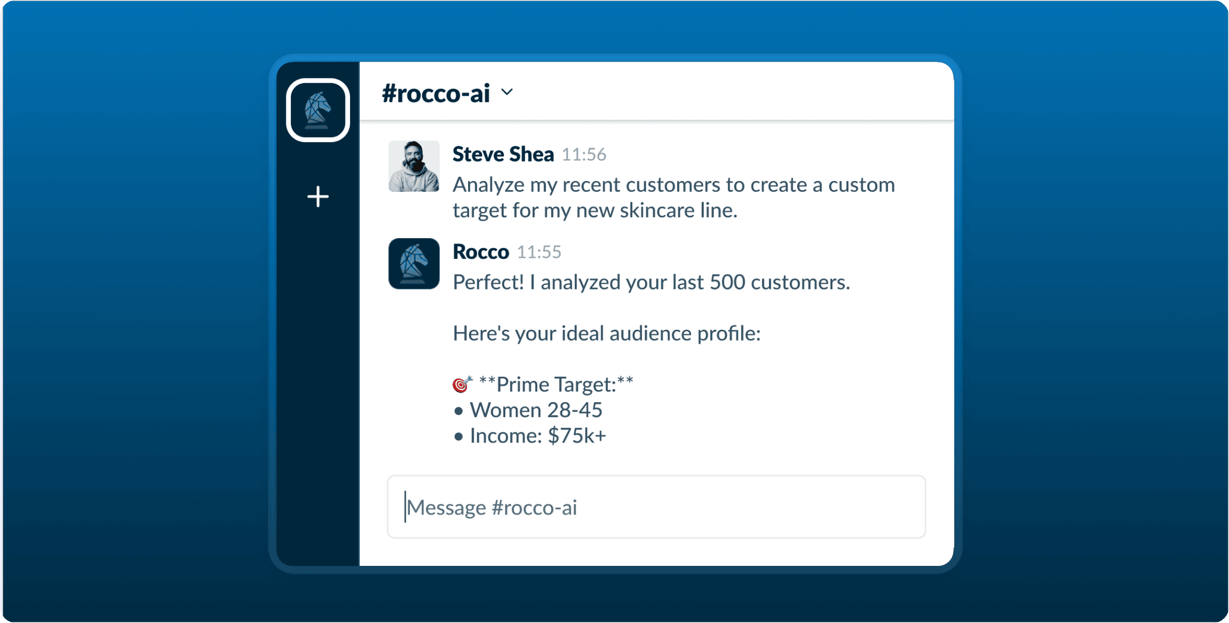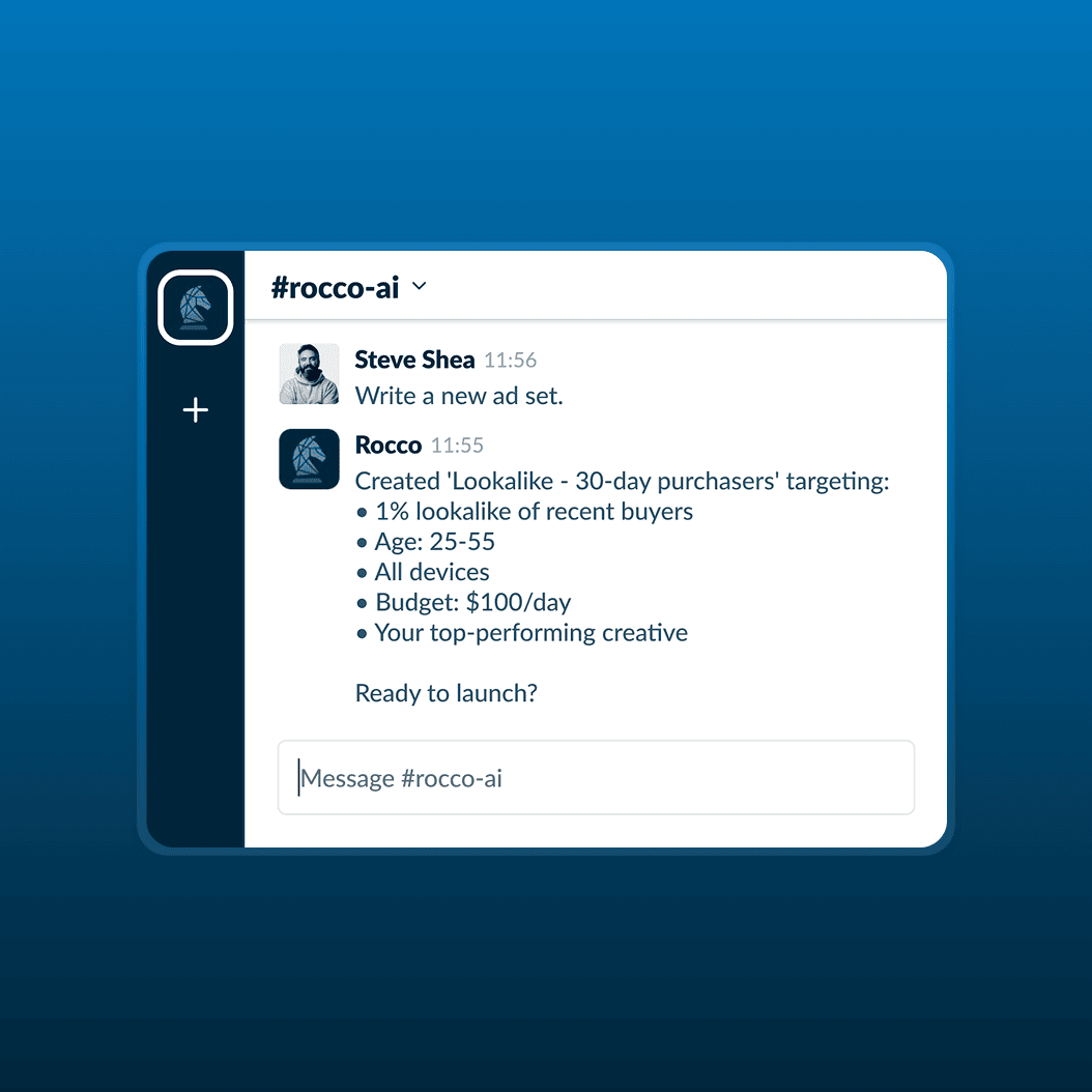 Rocco helps you create winning ad sets directly in Slack with simple messages.