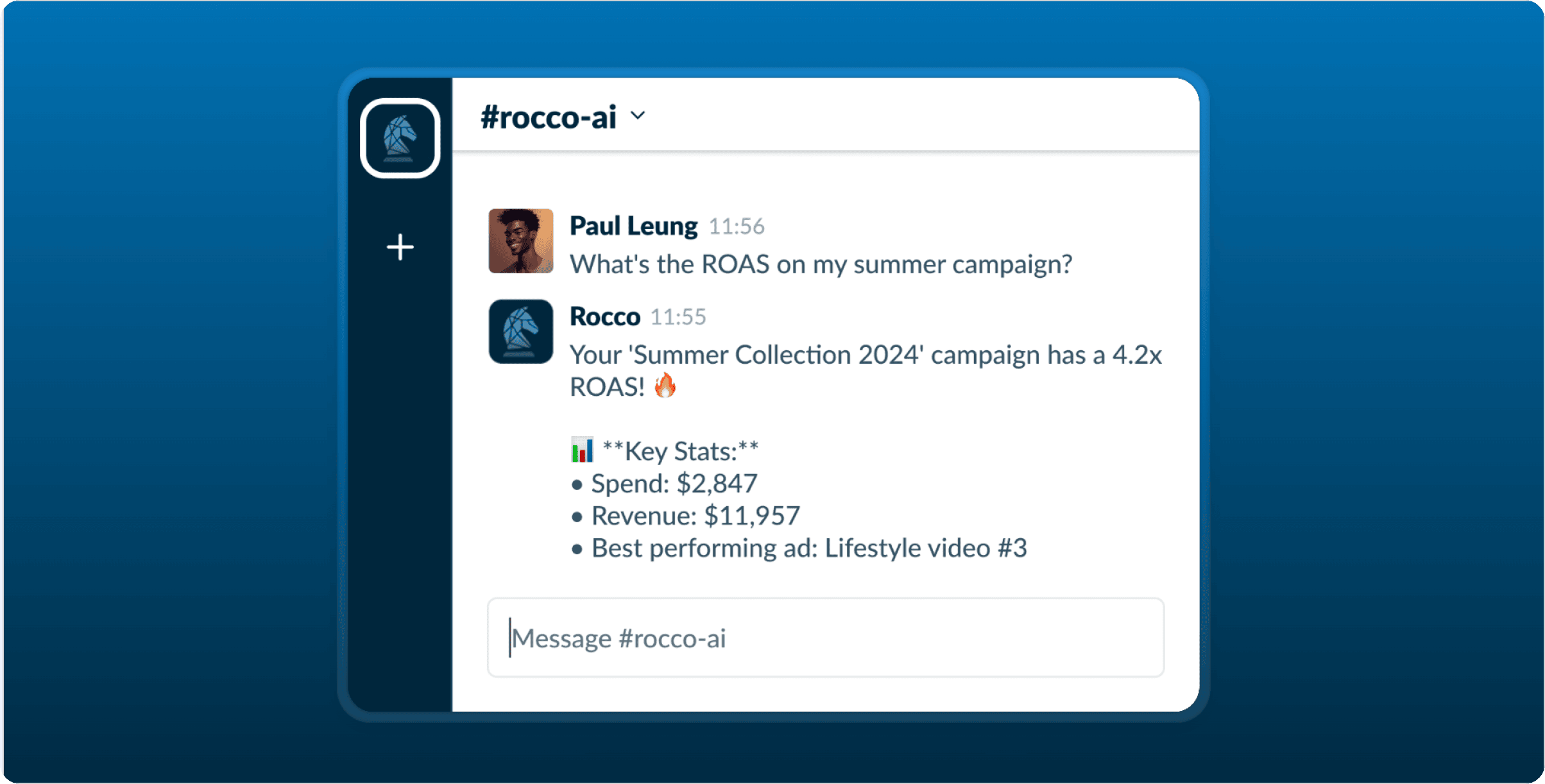Rocco analyzes your ad creatives in real time and shows which ads are driving results, right in Slack. No dashboards, no digging.