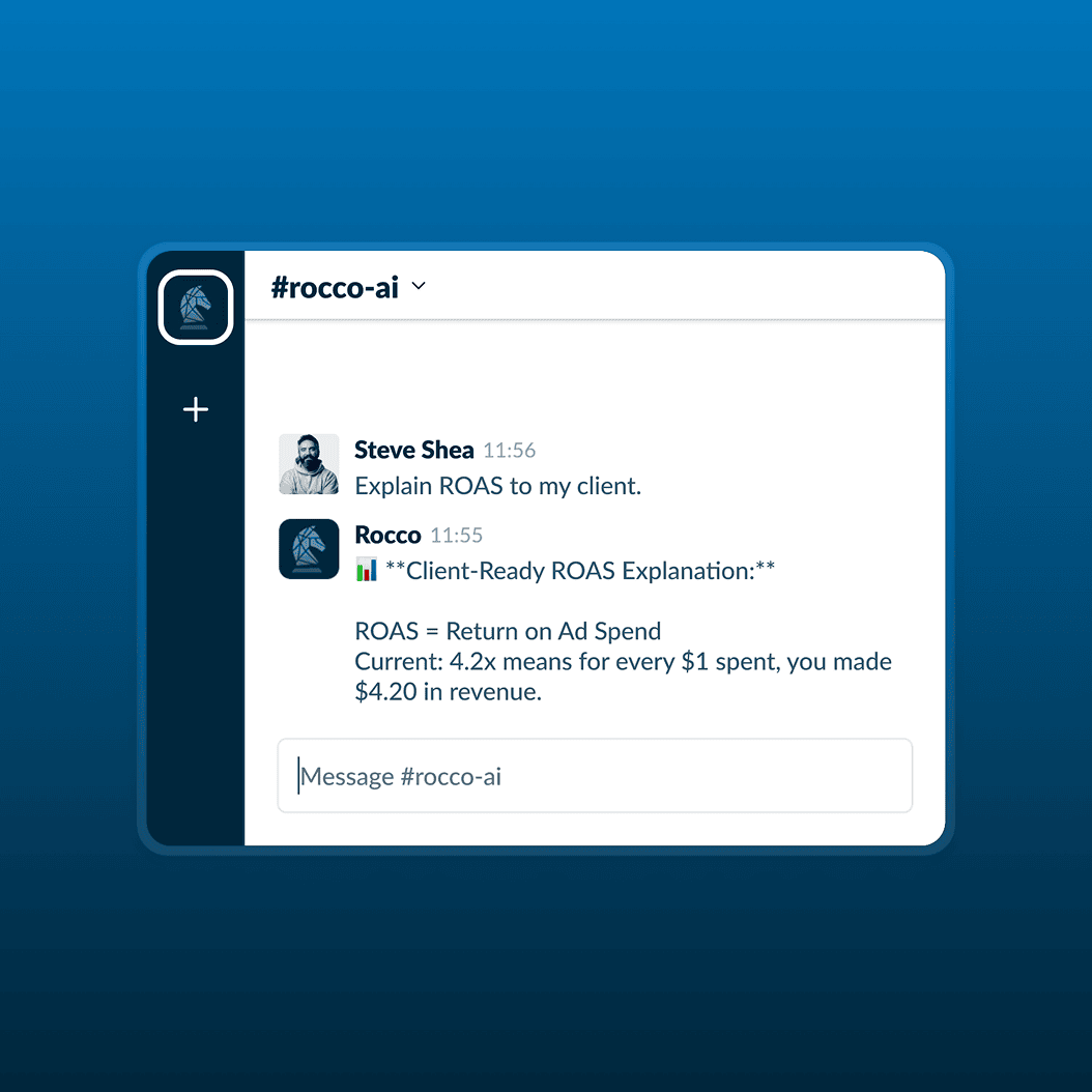 Rocco eliminates the daily grind of checking ads, comparing campaigns, and pulling reports. Just ask questions like “Which campaign brought in the most leads this week?” or “How’s my ROAS trending?” and Rocco gives you the answer instantly. What used to take 30 minutes now takes 10 seconds.